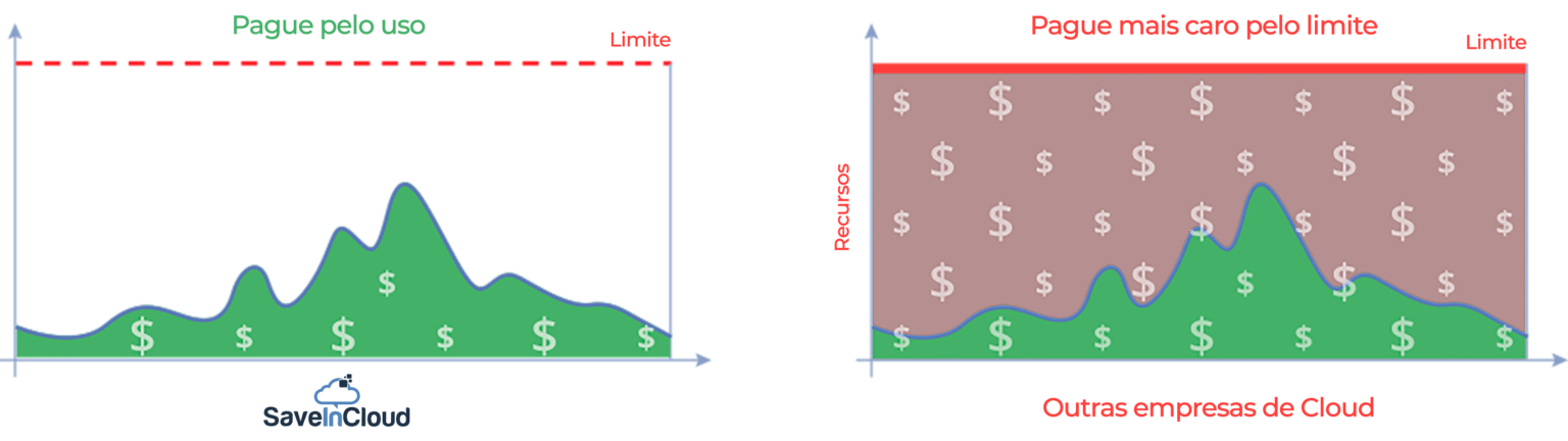 Nosso Cloud é cobrado por consumo por hora. Crie seus ambientes de acordo com sua necessidade, e pague somente o que usar. Sua economia pode ser até 80% do seu custo atual, entenda a diferença na imagem abaixo.