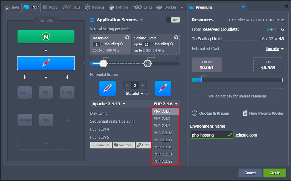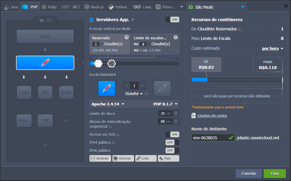 Múltiplas versões de PHP disponíveis. Cluster PHP (opcional). Escolha entre Apache, Nginx ou Litespeed como servidor WEB